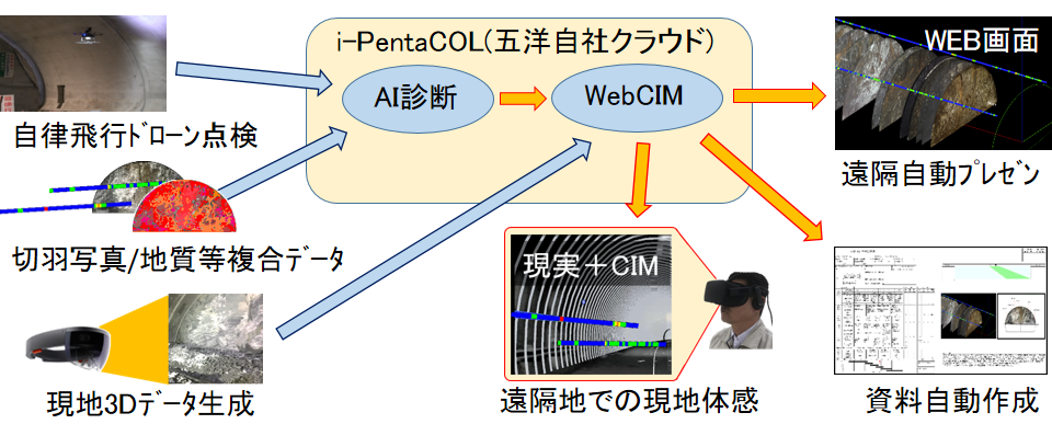 ・自律飛行ドローンによるトンネル覆工コンクリートを撮影し、AIによる変状抽出を 実施 (MRデバイス・・・現実世界にCGや物体などの仮想世界を投影し、それを体験する機器)