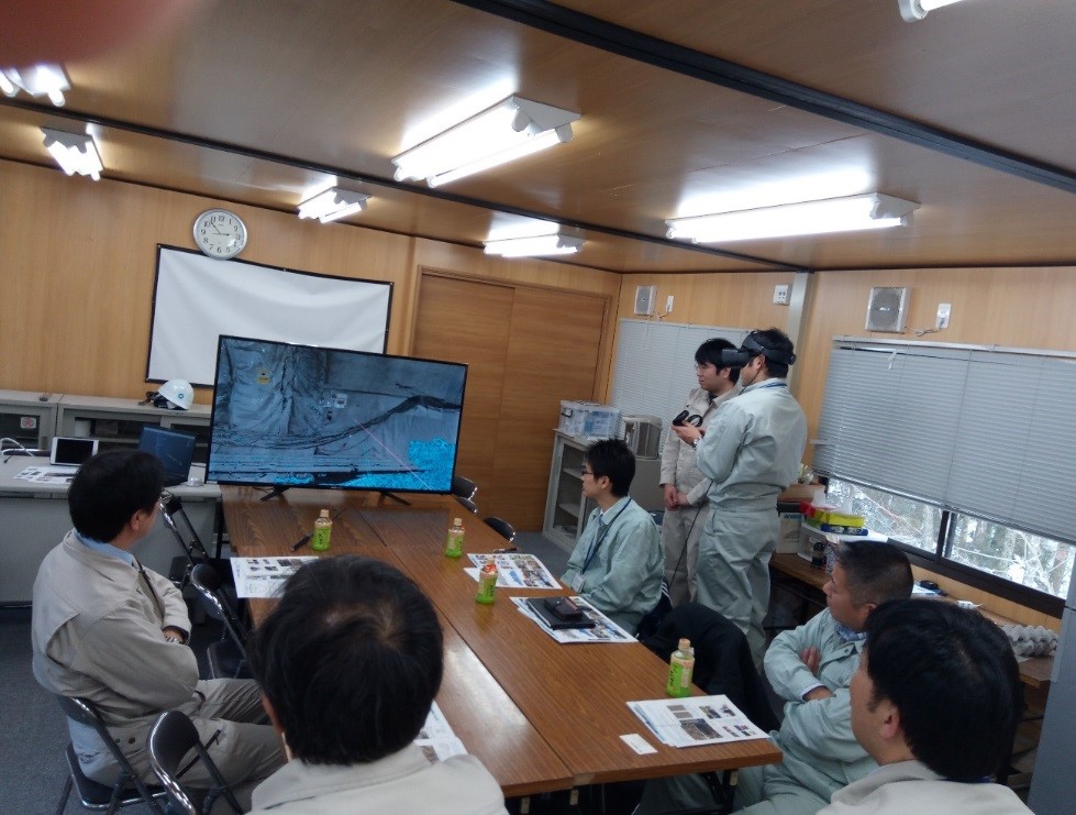 国土交通省 東北地方整備局による PRISM現場視察 発注者の国土交通省 東北地方整備局によるPRISM試行の現場視察を実施しました。本試行の技術説明、実施状況説明、遠隔MR臨場の体験および現場見学を行い、建設現場の将来像の一部を体感して頂きました。